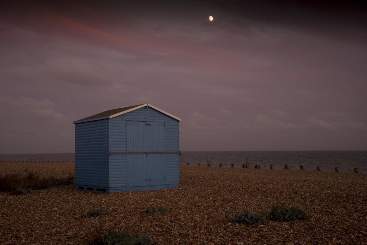 I'd noticed the beach hut all on its own on the shingle on a walk the previous day. I had also been tracking the position of the moon, which was just shy of full, throughout the previous few nights and I was pretty sure they would line up with each other close after sunset.