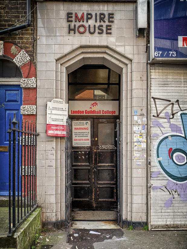One of the many photographs I took of Empire House was the doorway (left, 2015) and this appeared in my most recent book 'Whitechapel Doors'. I liked the way the architect had created the surround of the door by use of the stepped tiling. Incidentally, referring to the architectural drawing (above), it is clear that as late as 2015 the door itself was the original dating back to the 1930s. Although it might have been a nice feature to retain such an entrance, for reasons of building security a new front entrance and fire exit was required. However as can be seen in the refurbishment (right) the original aperture and tiling has been kept along with refurbished building signage. The use of a glass panel in the renovated aperture makes the interior look inviting compared to the previous panelled door.