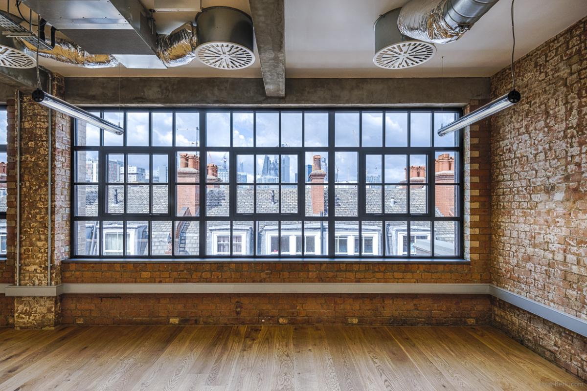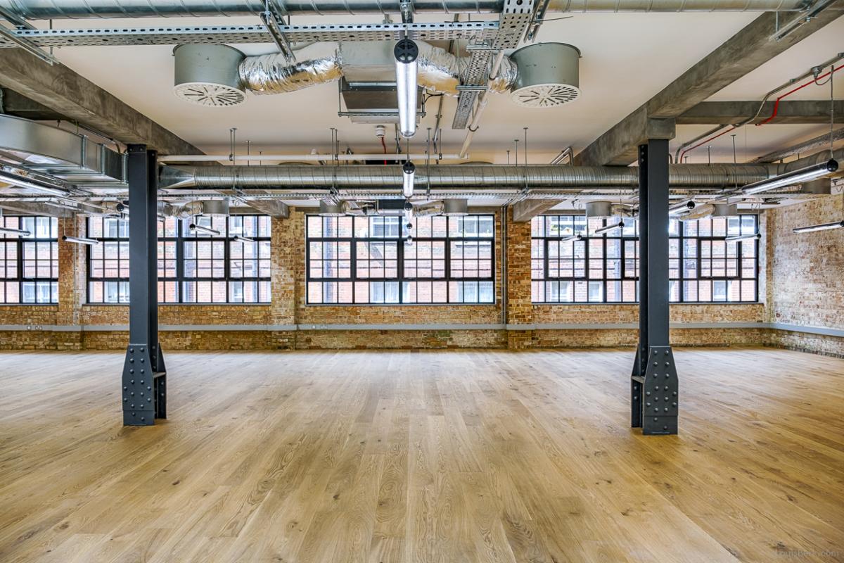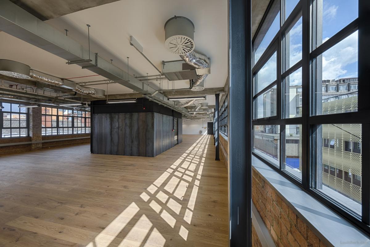 A building which contained a maze of offices and sublets has now been transformed into an open plan space. In the centre can be seen the new lift structure which has been enclosed to form secure entrance to each floor. Out of the windows to the right can be seen the recently refurbished Abernethy Building of Queen Mary University and on the left hand side the rooftops of Fieldgate Mansions.