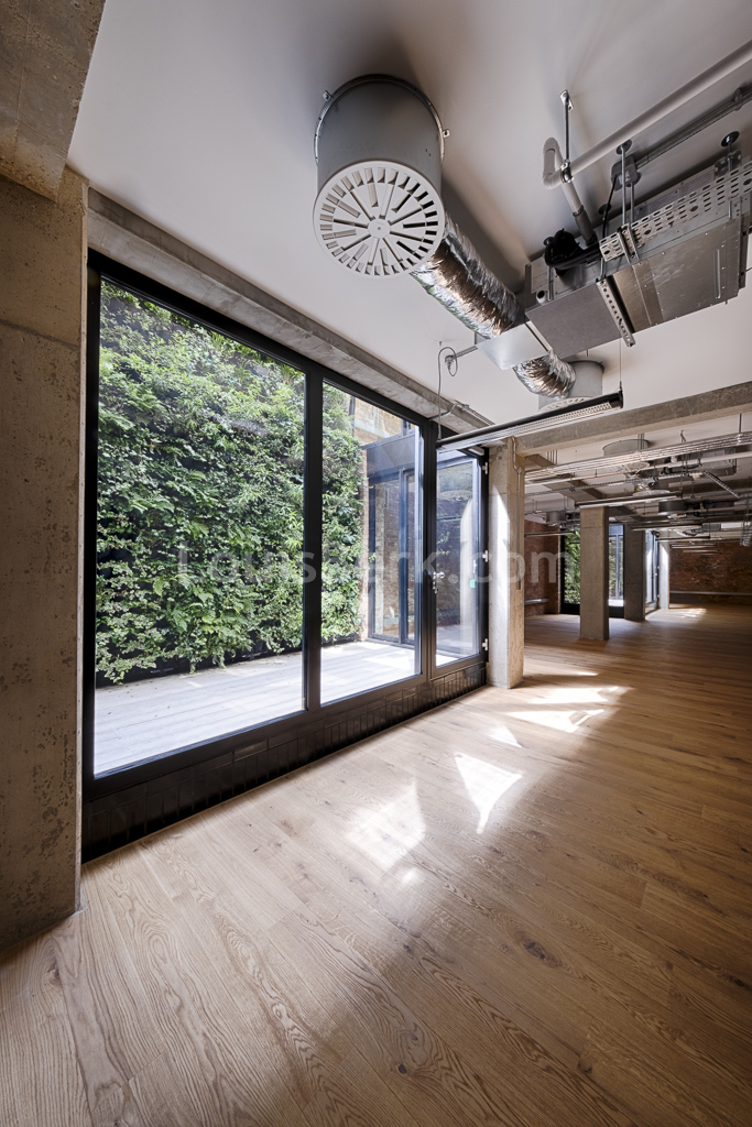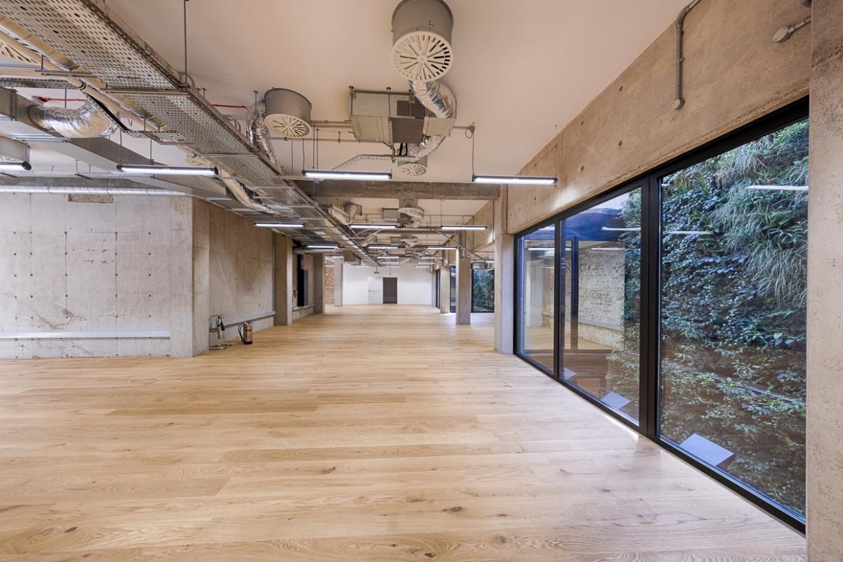 A challenge was presented by the original basement to the building, which is referred to on the architectural drawings as the 'Owners Warehouse'. Created long before regulations about natural daylight it was entirely enclosed. The space was transformed by the creation of two light wells on the back of the building. Note the use of a natural walls to bring foliage as well as light into the space.