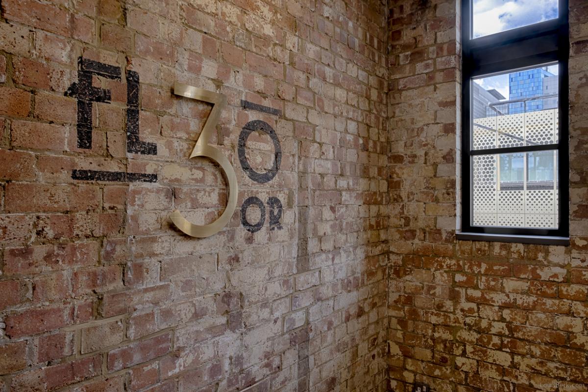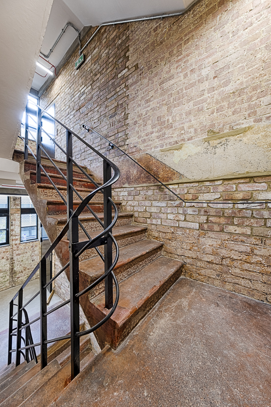 "Exposed" - the brickwork, steel beams and services of the renovated building.