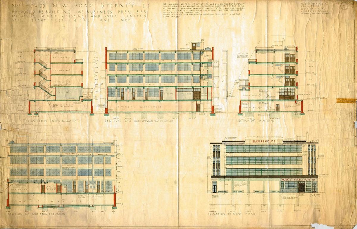 Empire House was originally built to replace the residence of 67-75 New Road in Whitechapel, for Morris Israel and Sons Ltd. As far as I can establish this was a dairy firm which specialised in egg distribution. I believe that the building also provided rentable space for other enterprises and I suspect many of these would have been involved in the clothing trade which formed an significant part of the manufacturing industry of the area both then and (to a lesser extent) still today.