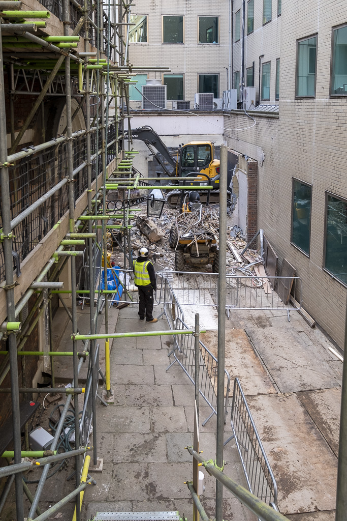 | Work underway: (l) the dramatic cladding of the exterior with scaffolding, (r) a mechanical digger removes a late 20th annexe to make way for a brand new museum and exhibition space, with facilties for educational and community programmes. | |