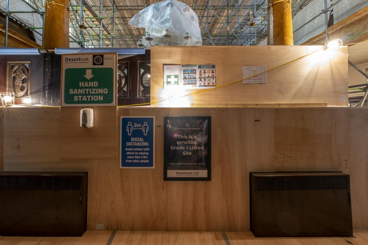 Once inside the extent of the work to restore the interior is also on a scale which impresses the eye. However, first stop on entering the synagogue is a reminder of the impact of the pandemic on all activity. Before I was allowed access to the site I had my temperature taken and at all times I wore a mask and gloves and avoided close proximity with the staff.