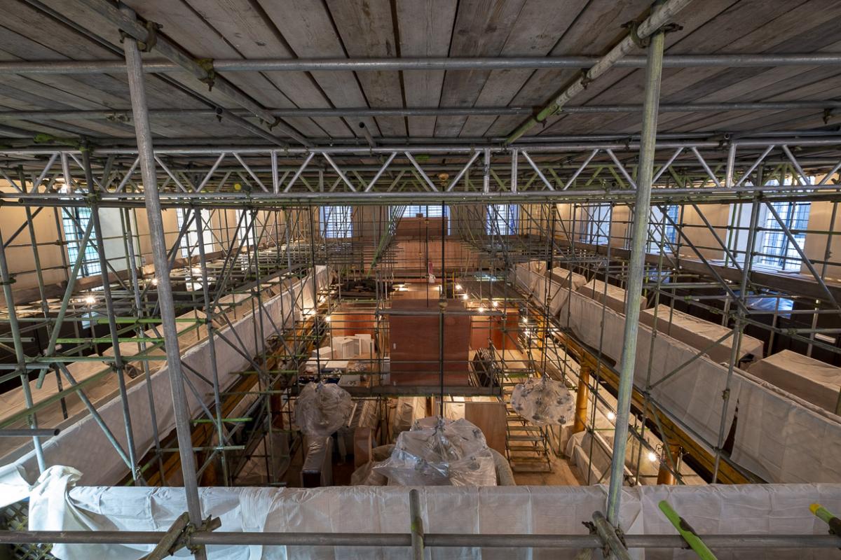 A dramatic view of the birdcage scaffold erected inside Bevis Marks Synagogue to allow repair and refurbishment