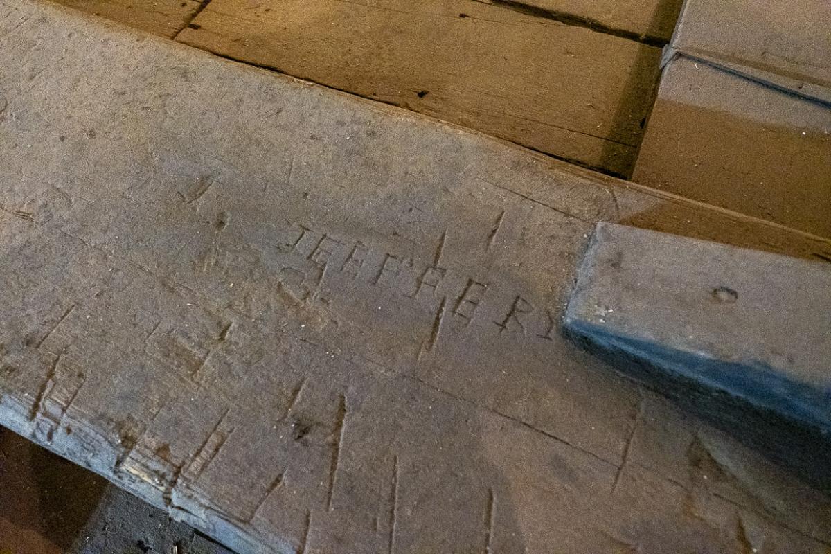 My guide pointed out several interesting features. There is an uncorroborated story that the timber used as the support for the chandelier (right, above) was donated from the mast of a naval ship by the Crown. Whatever its origin it is beautifully sawed and shaped single piece of a tree trunk. The method of holding the beam in place and the fixture for anchoring the chain to the chandelier are also authentic and interesting. You may be able to make out next to the lower left edge the word 'Jeeffery' scratched into the wood. An internet search for the word reveals it is not a mispelling of Jeffrey but a first name, no longer in common use, spelled as etched into the wood and with a German Jewish origin.