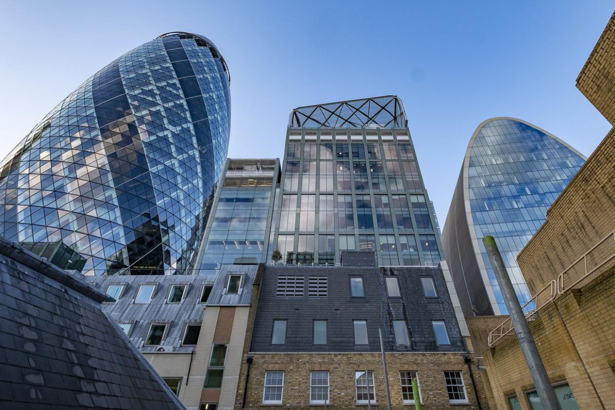 (l) 30 St Mary Axe (the 'Gherkin') and (r) 70 St Mary Axe Tower (the 'can of ham').