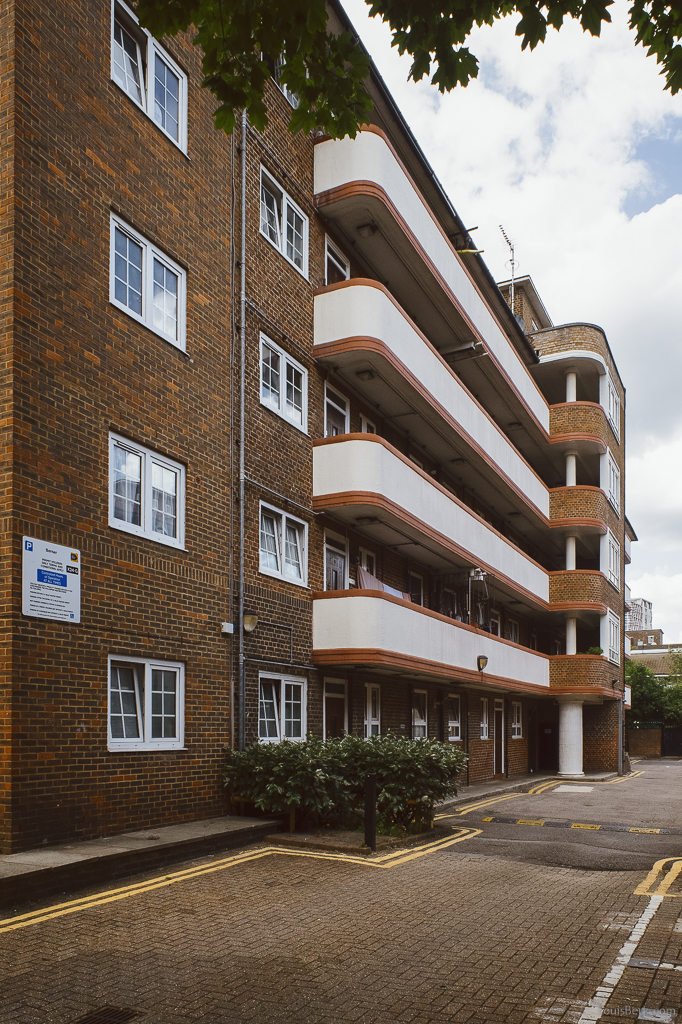 About half way down Pinchin Street are a number of early post-war London County Council housing blocks. Many of these streets that were bombed out during the blitz in WWII. The brickwork on these buildings is immaculate and a very distinctive feature are the 'fluted' baclonies and lift shafts with their fluid curves.